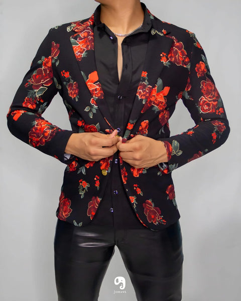 BLAZER SOLAPA V EXOTICO NEGRO CON FLORES ROJAS CON DORADO