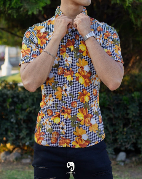 CAMISA MANGA CORTA ESTAMPADA PIXELES Y FLORES AMARILLAS