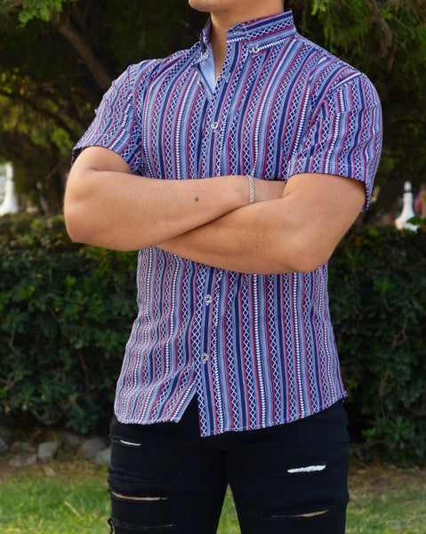 CAMISA MANGA CORTA ESTAMPADO TRIBAL EN BLANCO Y AZUL MARINO