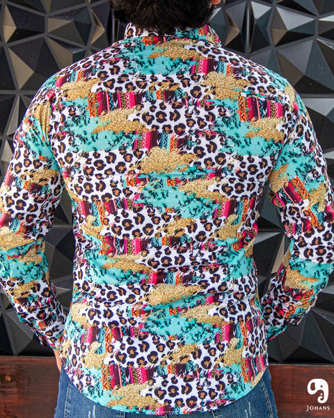CAMISA PARA CABALLERO CON ESTAMPADO, ÉSTE YA ES PARTE DE LA TELA, EN CORTE SLIM FIT.