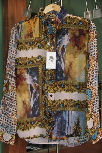 CAMISA PARA CABALLERO CON ESTAMPADO, ÉSTE YA ES PARTE DE LA TELA, EN CORTE SLIM FIT.